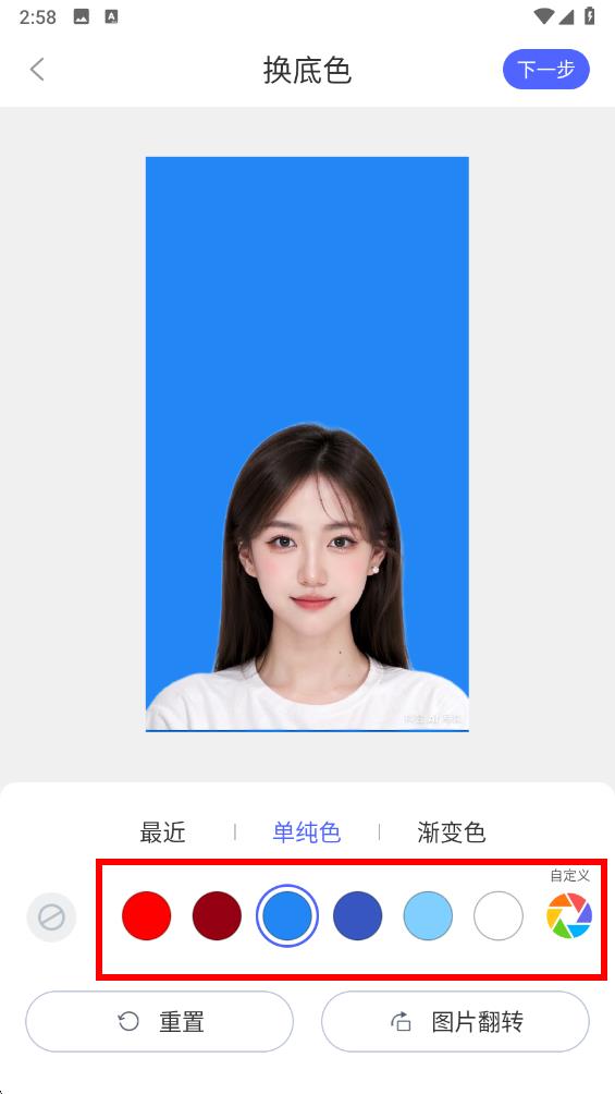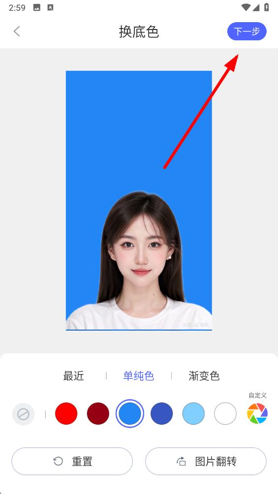 4、確定底色選項(xiàng)后,點(diǎn)擊右上角的下一步,即可完成證件照底色更換。