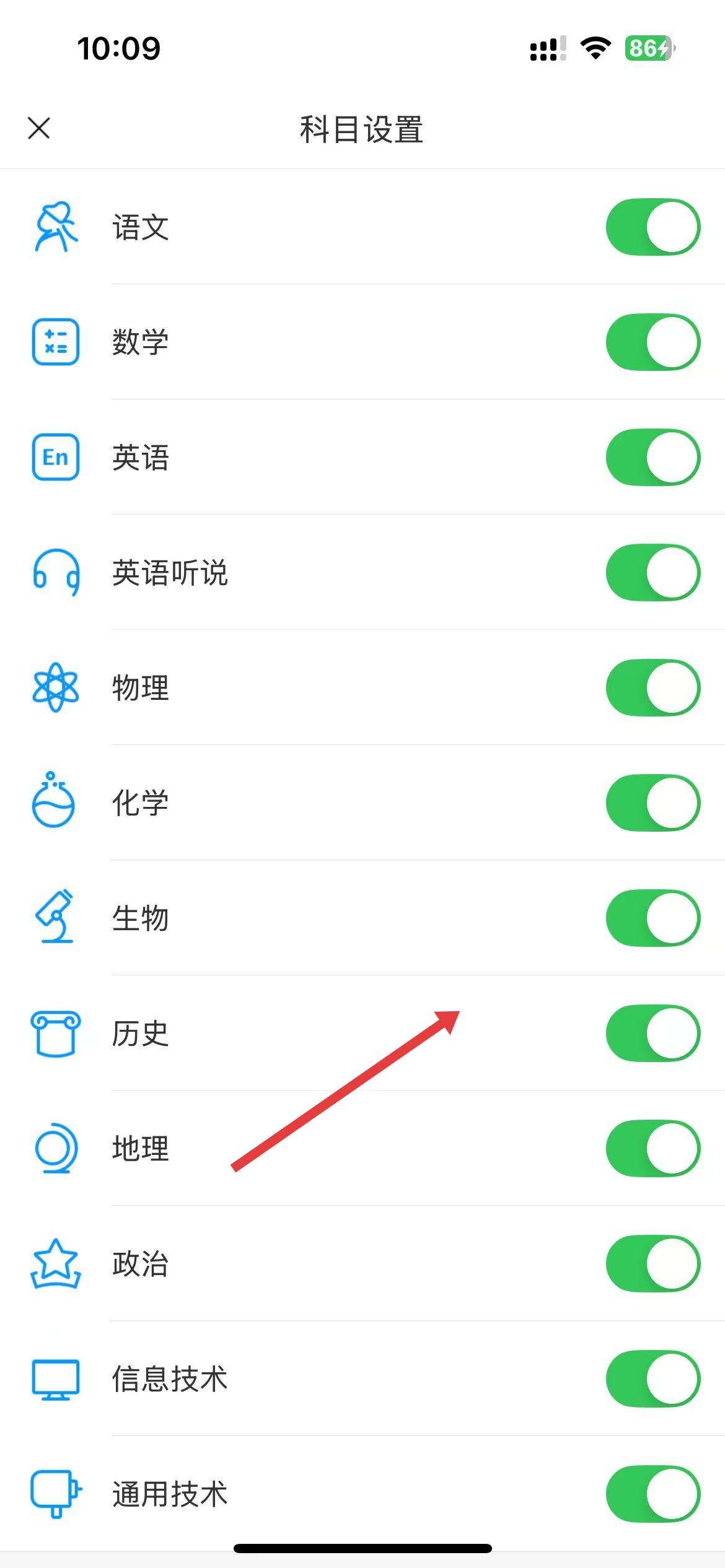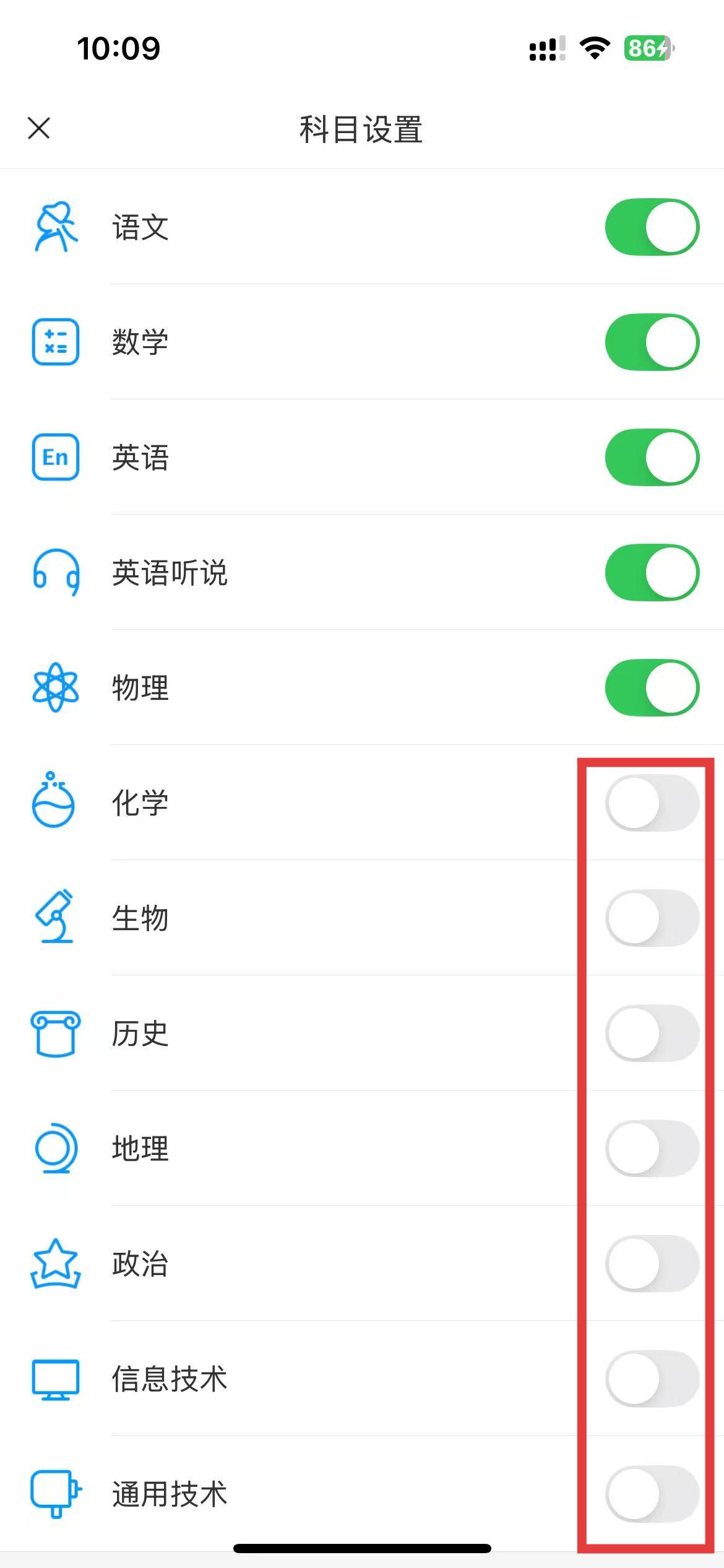 2、在科目設(shè)置界面,能看到各學(xué)科選項(xiàng),點(diǎn)擊想添加題目的學(xué)科右側(cè)灰色開關(guān)按鈕。