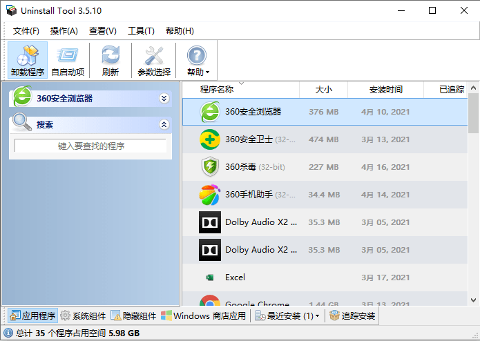 uninstall tool為綠色版免安裝,打開(kāi)就可以使用,無(wú)需安裝教程和教程,也不需要密鑰、注冊(cè)碼。這是一個(gè)電腦強(qiáng)力卸載軟件,可以卸載系統(tǒng)工具,和其他軟件程序,并且刪的很干凈,減少電腦中的垃圾。