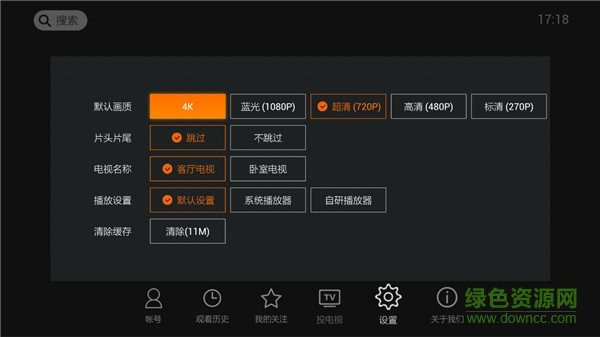 2.在云視聽極光的“設(shè)置”中,可以對(duì)電視的畫質(zhì)進(jìn)行選擇。不僅能選擇超清視頻,還可以選擇藍(lán)光和4K畫質(zhì)。電視的片頭片尾也可以自由選擇跳過或者不跳過。還有電視名稱、播放設(shè)置都可以根據(jù)用戶自己的需求進(jìn)行選擇。同時(shí)南極TV還自帶清除緩存功能,這樣以后看完電視清理一下,就不怕占用內(nèi)存了。