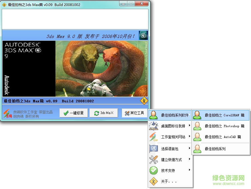 最佳拍檔之3ds Max篇是一款專為3ds Max推出的助手,讓你快速獲取最新的3ds軟件和修復(fù)工具,隨時解決你的各種煩惱,綠色資源網(wǎng)歡迎大家免費下載!