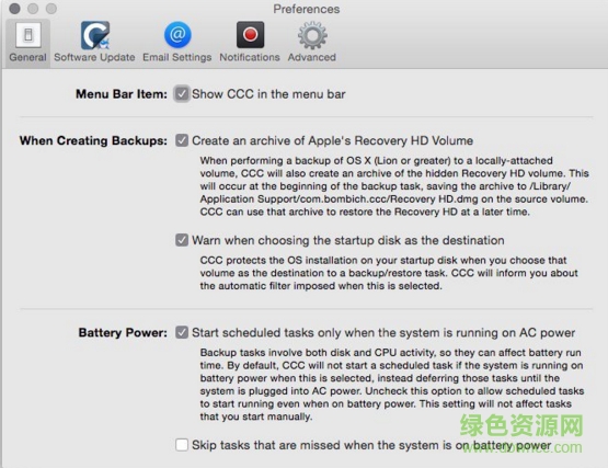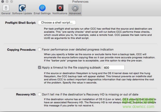 2.Carbon Copy Cloner 的偏好設(shè)置中,可以選擇是否在菜單欄中顯示圖標,是否創(chuàng)建蘋果恢復(fù)分區(qū)的備份等。最后還可以只在 Mac 連接電源時進行備份。高級工下,可以選擇腳本完成任務(wù),需要有一定的編程基礎(chǔ)。一般用戶使用不到。Carbon Copy Cloner的功能很簡單,整體備份過程很平穩(wěn),適合一次性全盤備份。