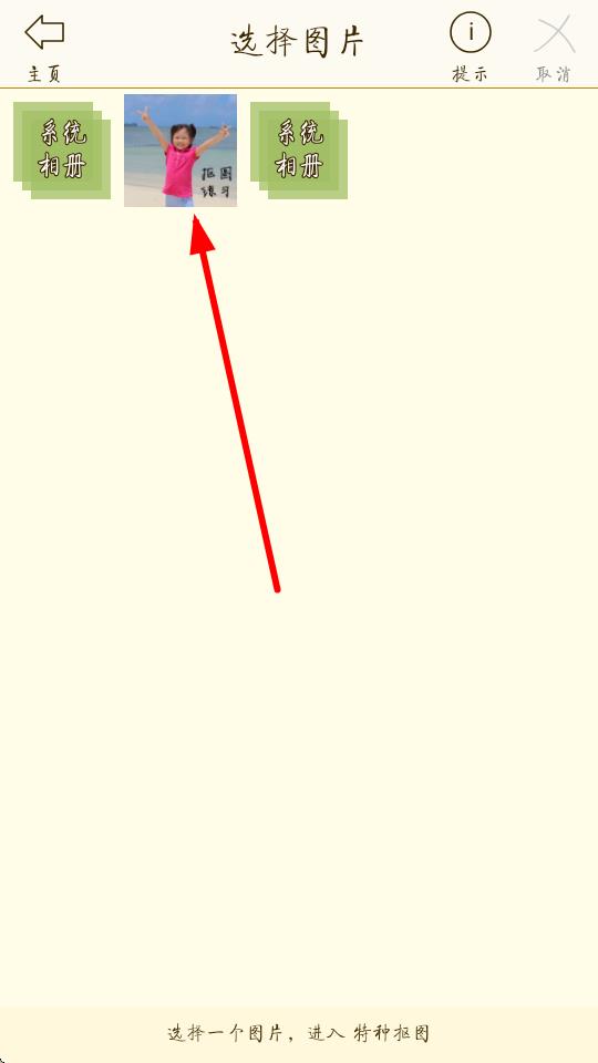 2、進(jìn)入選擇圖片界面,從系統(tǒng)相冊(cè)里選中需要進(jìn)行摳圖的圖片。