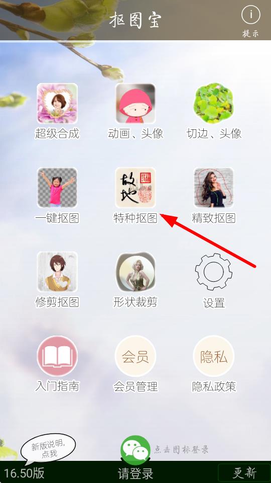 1、在手機(jī)上打開(kāi)摳圖寶應(yīng)用,點(diǎn)擊特種摳圖選項(xiàng)準(zhǔn)備導(dǎo)入圖片。