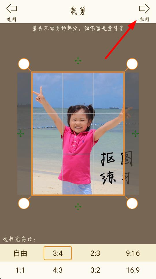 3、對(duì)選中的圖片進(jìn)行裁剪,按需選擇寬高比,完成后點(diǎn)擊右上角摳圖。