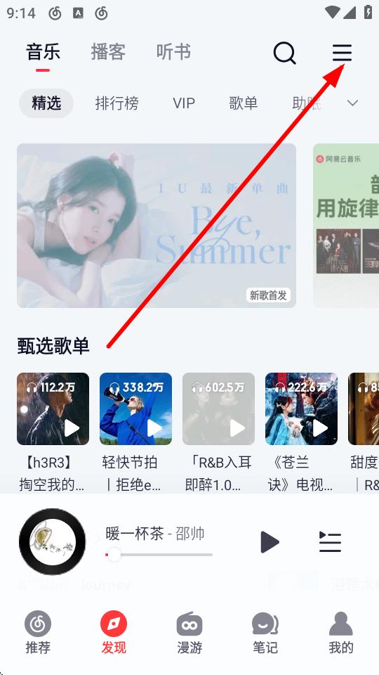 1、打開網(wǎng)易云音樂App點(diǎn)擊首頁(yè),右上角三圖標(biāo)開側(cè)邊欄。