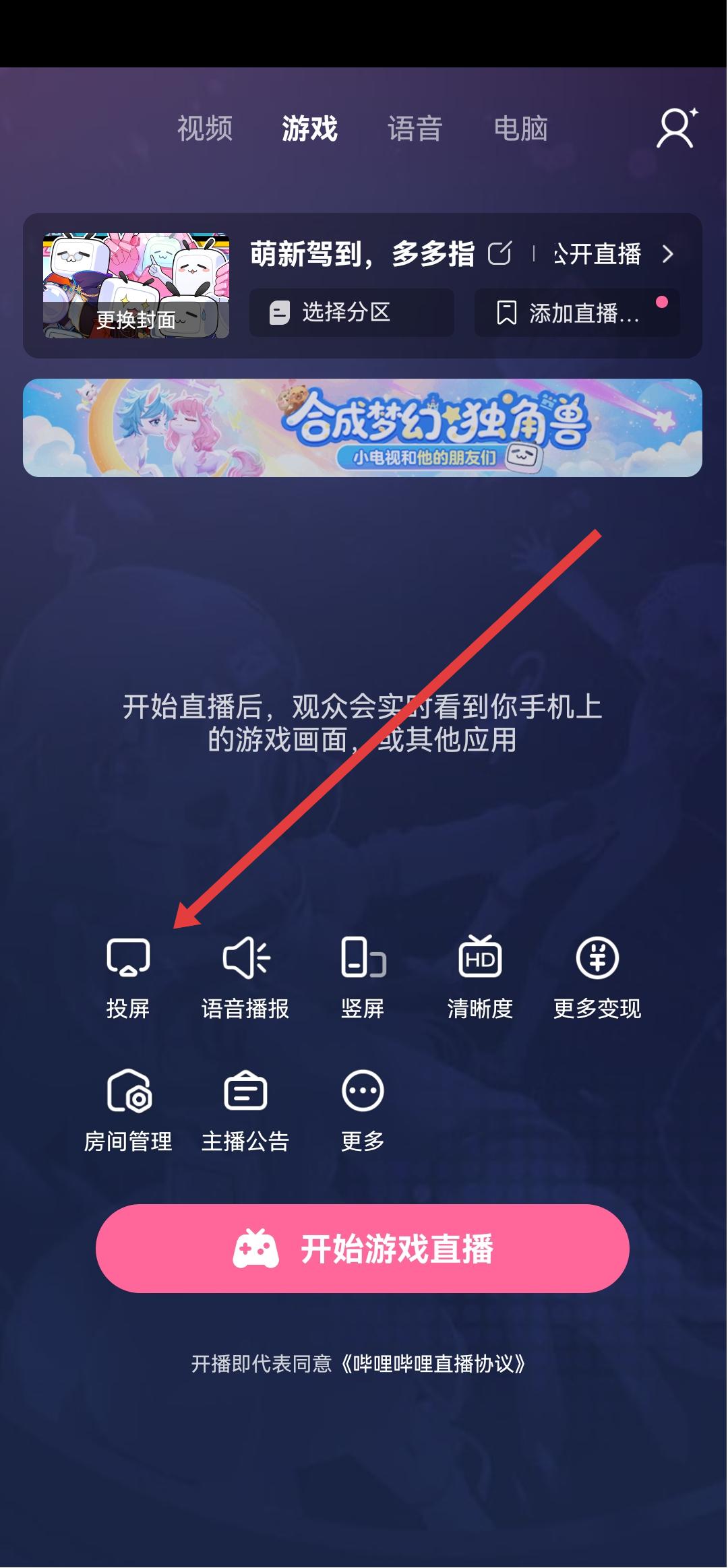 1、打開嗶哩嗶哩直播姬,進(jìn)入游戲直播設(shè)置界面,點(diǎn)擊投屏的選項(xiàng)。
