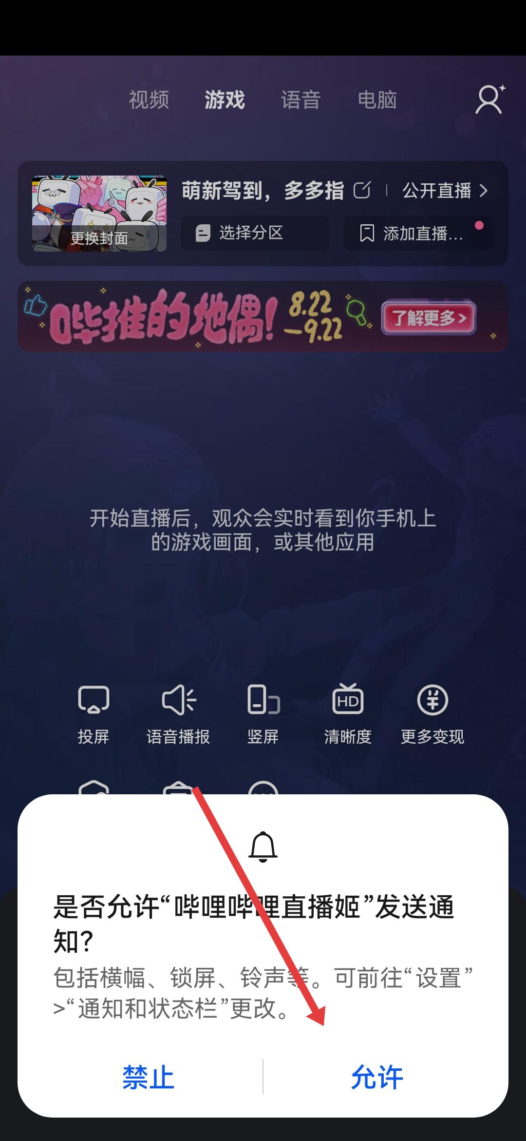2、當(dāng)彈出是否允許嗶哩嗶哩直播姬發(fā)送通知的提示時(shí),點(diǎn)擊允許。
