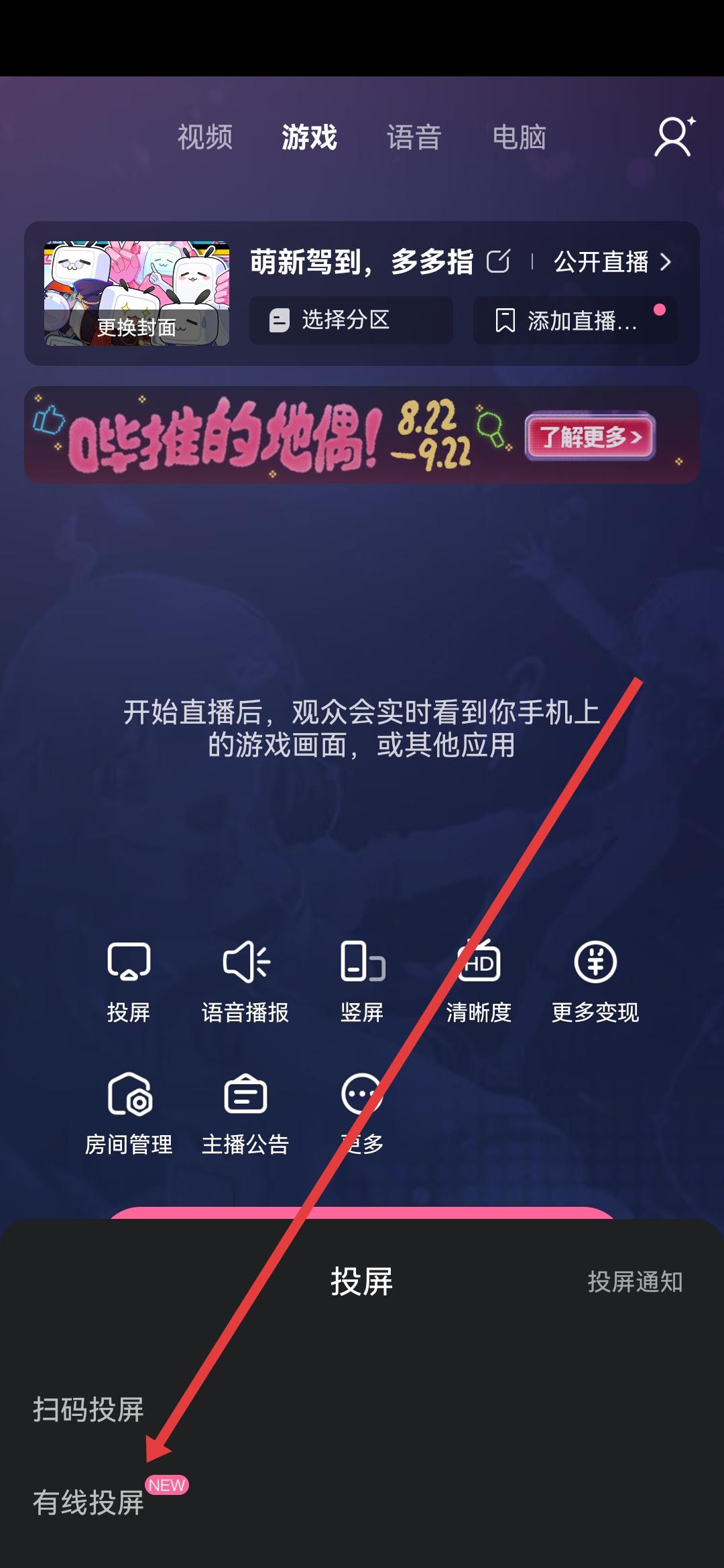 3、需要在直播投屏的選項(xiàng)中,我們這邊可以選擇有線投屏的功能。