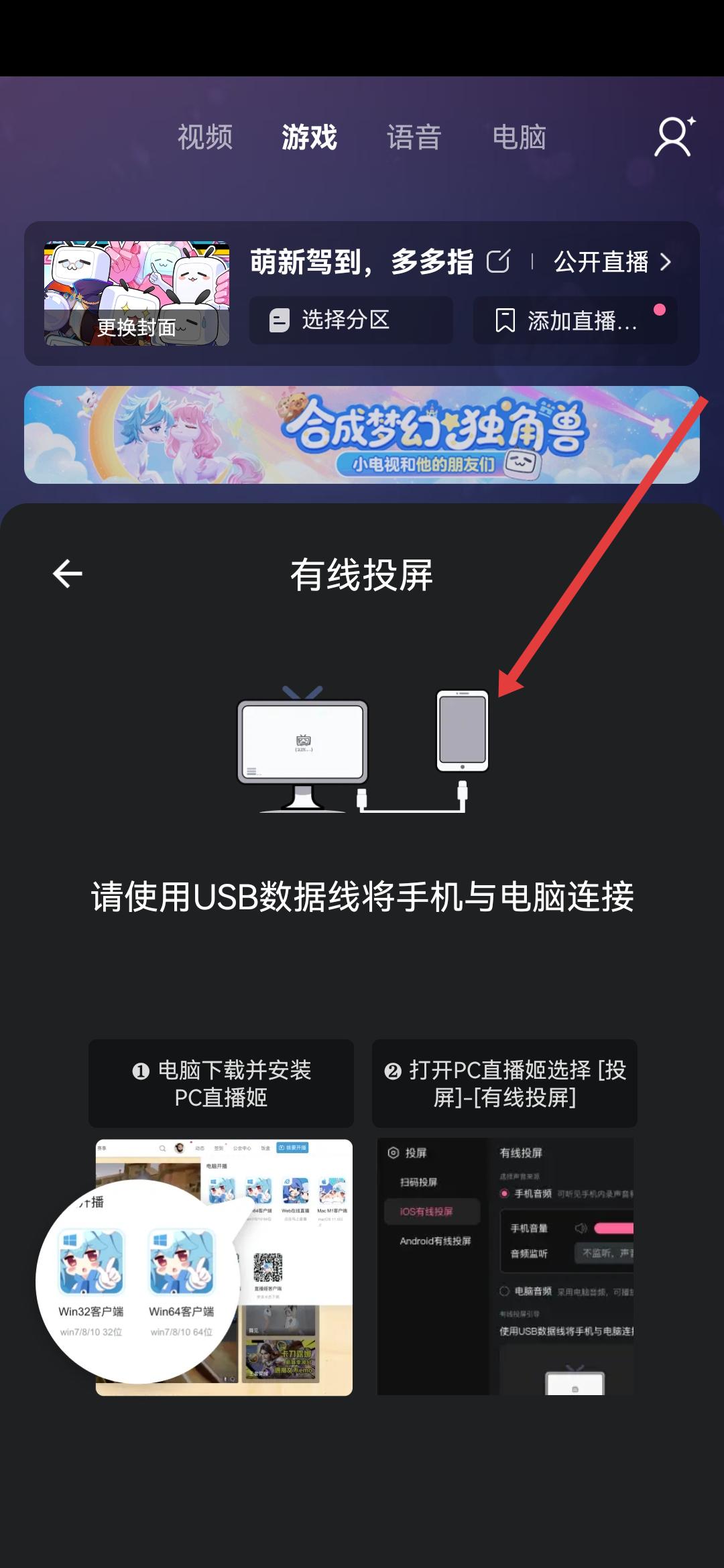 4、按照指引使用USB數(shù)據(jù)線將手機(jī)與電腦連接,同時(shí)確保電腦已下載并安裝PC直播姬,完成投屏操作。