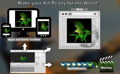 4.可以導(dǎo)出你的動畫到電影,GIF,F(xiàn)BX,Spritesheets格式,提供全深度在線文檔和視頻教程和示例。
