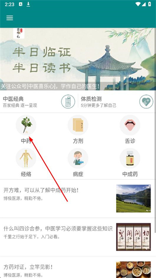 1、打開大中醫(yī)APP,在首頁點(diǎn)擊中藥選項。