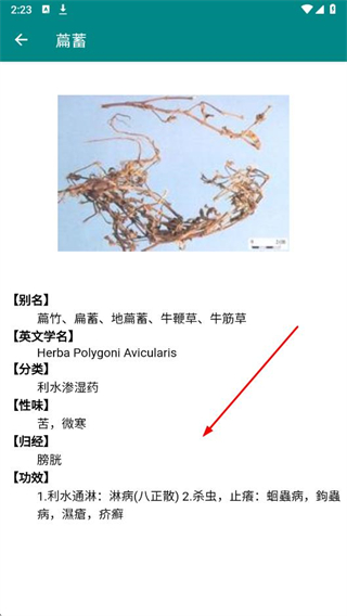 3、進(jìn)入具體中藥詳情頁面,查看功效部分內(nèi)容,即可了解該中藥的功能。