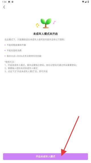 4、仔細閱讀未成年人模式后,再點擊開啟未成年人模式的按鈕即可。