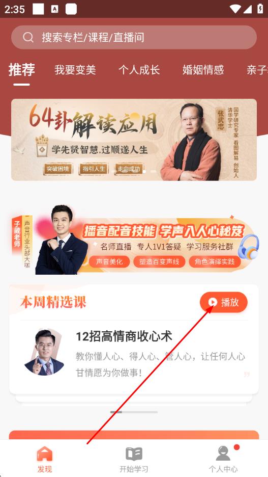 1、打開荔課App,在發(fā)現(xiàn)頁(yè)面找到想要觀看的課程,點(diǎn)擊課程播放按鈕。