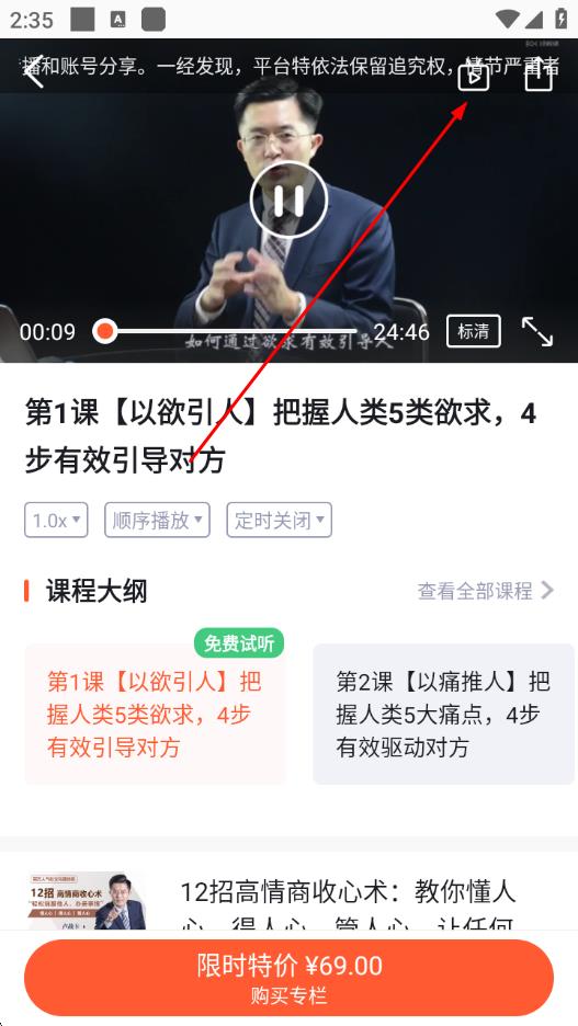 3、在課程播放界面中,點(diǎn)擊視頻右上角的投屏圖標(biāo)。