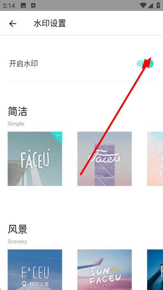 3、在水印設置頁,水印開關,選擇水印樣式,拍攝時自動添加專屬水印,讓照片更具標識性。