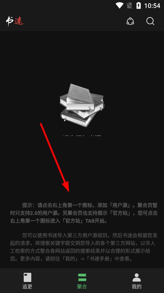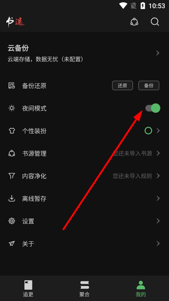 3、開啟夜間模式后,返回應(yīng)用主界面,如在聚合頁等界面,即可在夜間模式下使用書迷應(yīng)用閱讀。