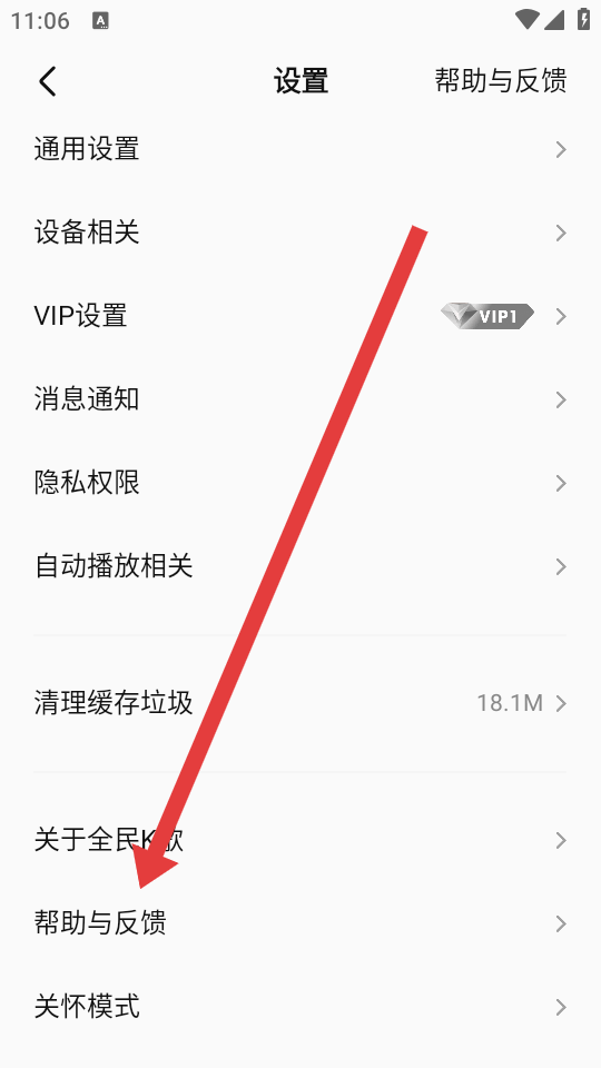 1、進(jìn)入全民K歌設(shè)置頁(yè)面后,需要點(diǎn)擊幫助與反饋,進(jìn)入幫助與反饋界面。