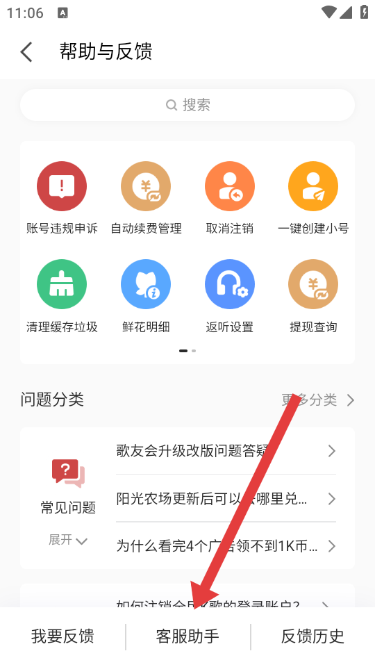 2、在幫助與反饋?lái)?yè)面中,點(diǎn)擊底部的客服助手,進(jìn)入客服咨詢(xún)的界面。