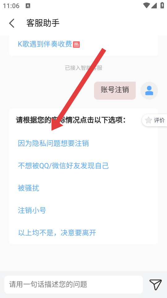 3、在客服助手頁(yè)面里,輸入賬號(hào)注銷(xiāo)并發(fā)送,然后根據(jù)實(shí)際情況選擇注銷(xiāo)原因,按提示完成賬號(hào)注銷(xiāo)流程。
