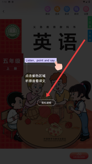 1、在進(jìn)入點(diǎn)讀課本頁面時(shí),瀏覽完使用方法后點(diǎn)擊屏幕中的我知道啦按鈕,開始使用。