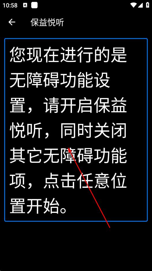 3、按照提示,開啟保益悅聽,并關(guān)閉其他無障礙功能項(xiàng),點(diǎn)擊屏幕任意位置開始設(shè)置。
