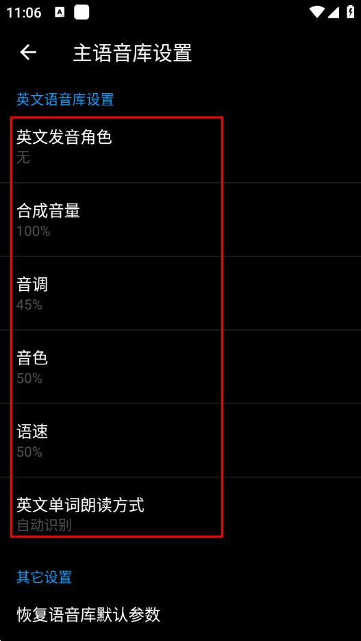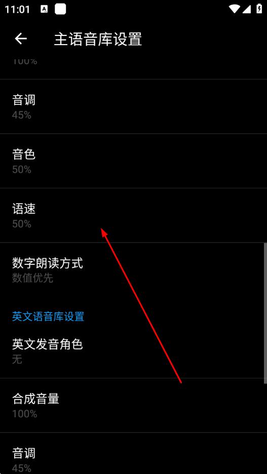4、可以在該頁面設(shè)置音調(diào)、音色等其他語音相關(guān)參數(shù)。