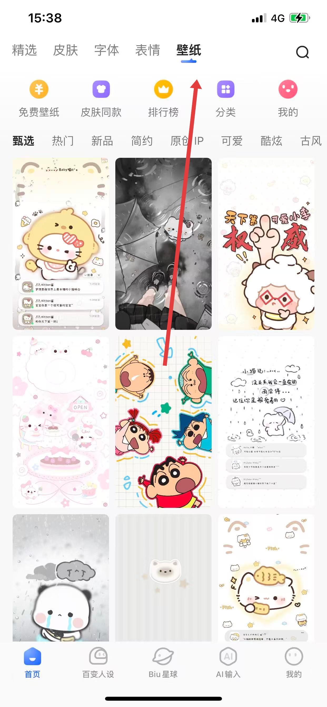 1、打開訊飛輸入法APP,進(jìn)入首頁,在上方菜單欄中找到并點(diǎn)擊壁紙選項(xiàng)。