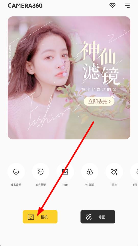 1、打開相機360應用,在主界面點擊下方黃色的相機按鈕,進入拍攝界面。