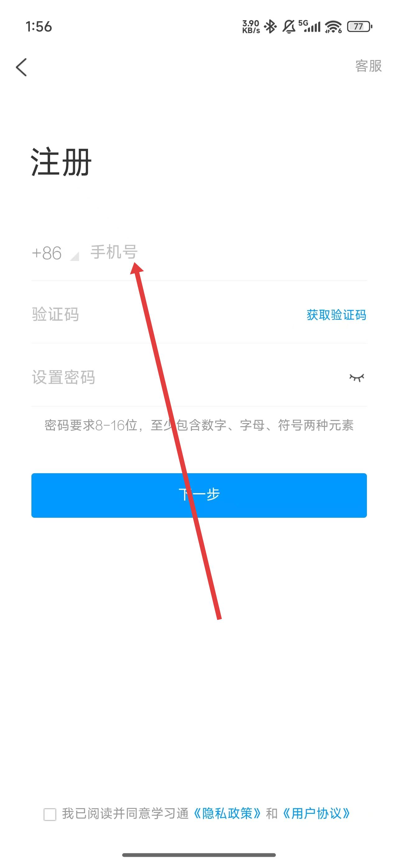 3、在注冊操作頁面中,點(diǎn)擊輸入框輸入手機(jī)號以便獲取驗(yàn)證碼。