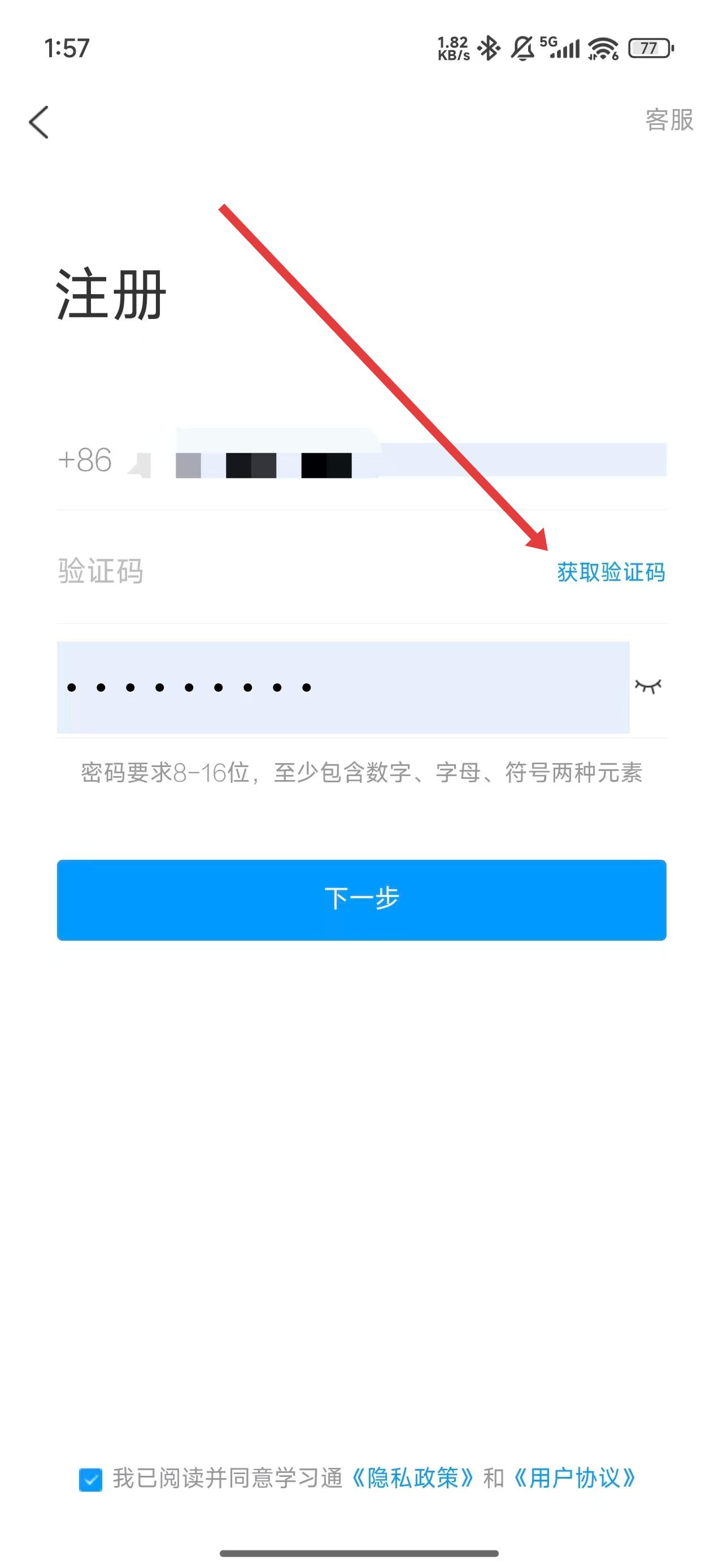 4、點(diǎn)擊獲取驗(yàn)證碼按鈕,等待一段時(shí)間填寫驗(yàn)證碼即可完成注冊操作。