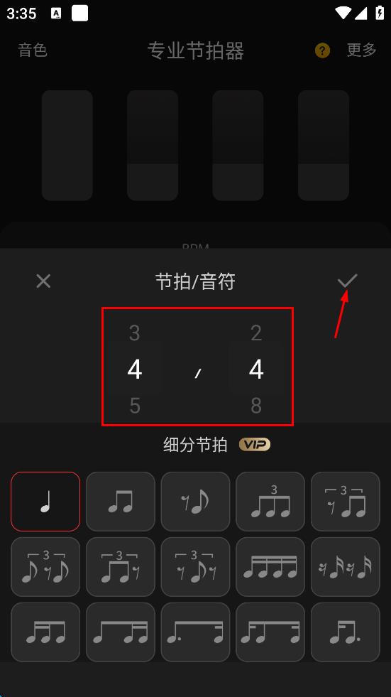 3、在節(jié)拍/音符設(shè)置界面,選擇所需的節(jié)拍數(shù)值,然后點(diǎn)擊確認(rèn)按鈕。