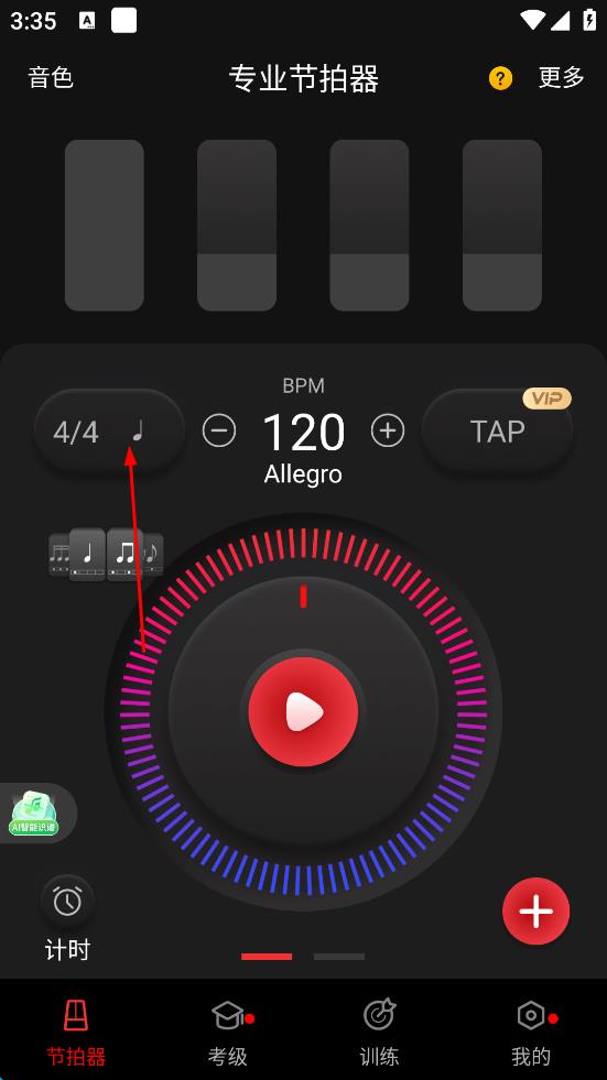 1、在節(jié)拍器右下角"拍/小節(jié)"里面輸入節(jié)拍數(shù),默認(rèn)為“4拍/小節(jié)”。