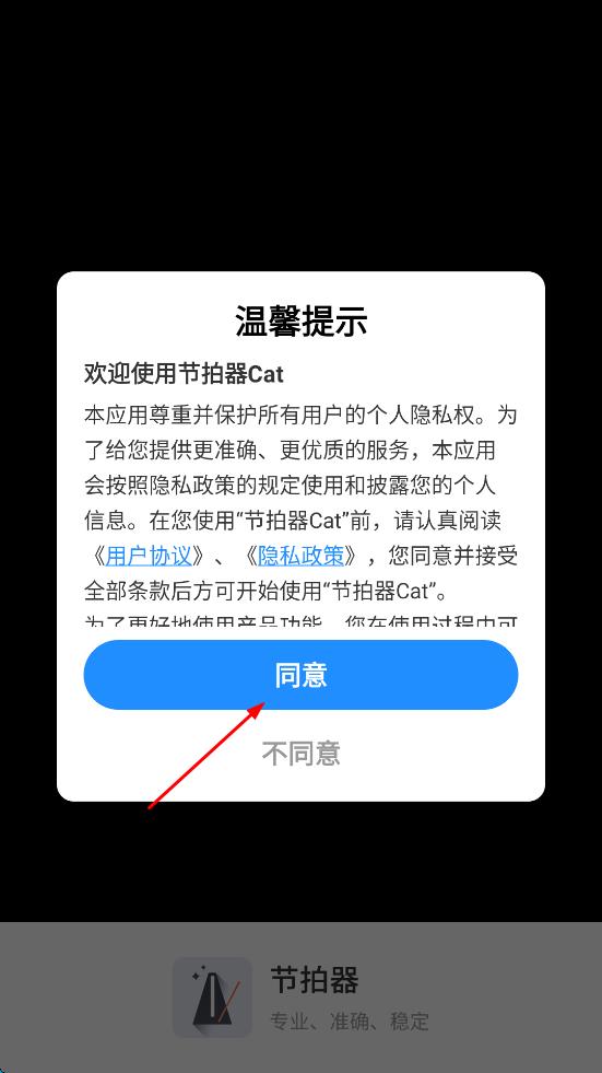 1、打開(kāi)節(jié)拍器Cat APP,出現(xiàn)溫馨提示彈窗,仔細(xì)閱讀內(nèi)容后,點(diǎn)擊同意按鈕。