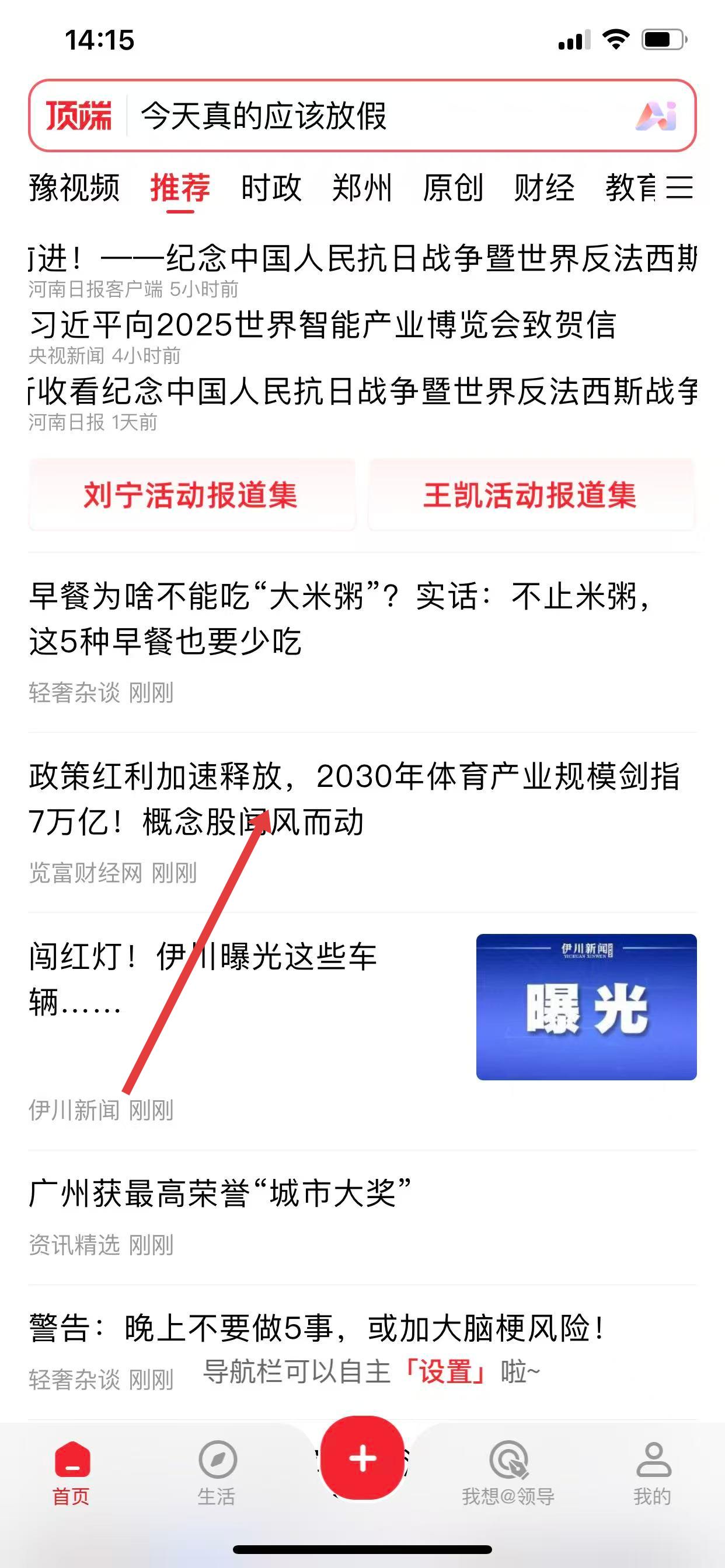 6.設(shè)置有各種頻道,包括鄭州、時政、經(jīng)濟(jì)、短視頻、直播等,能夠隨時切換查看。
