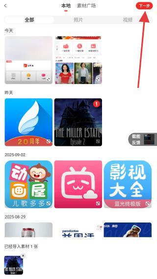 2、在本地素材廣場中,選擇要加入視頻的照片或視頻,可多選,選好后點擊右上角下一步。