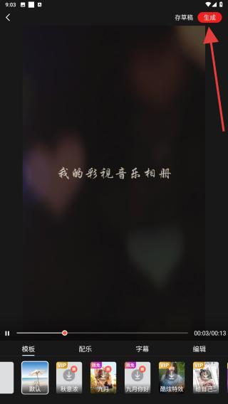3、在編輯界面下方,可選擇模板、配樂、字幕等功能,預覽滿意后點擊右上角生成。