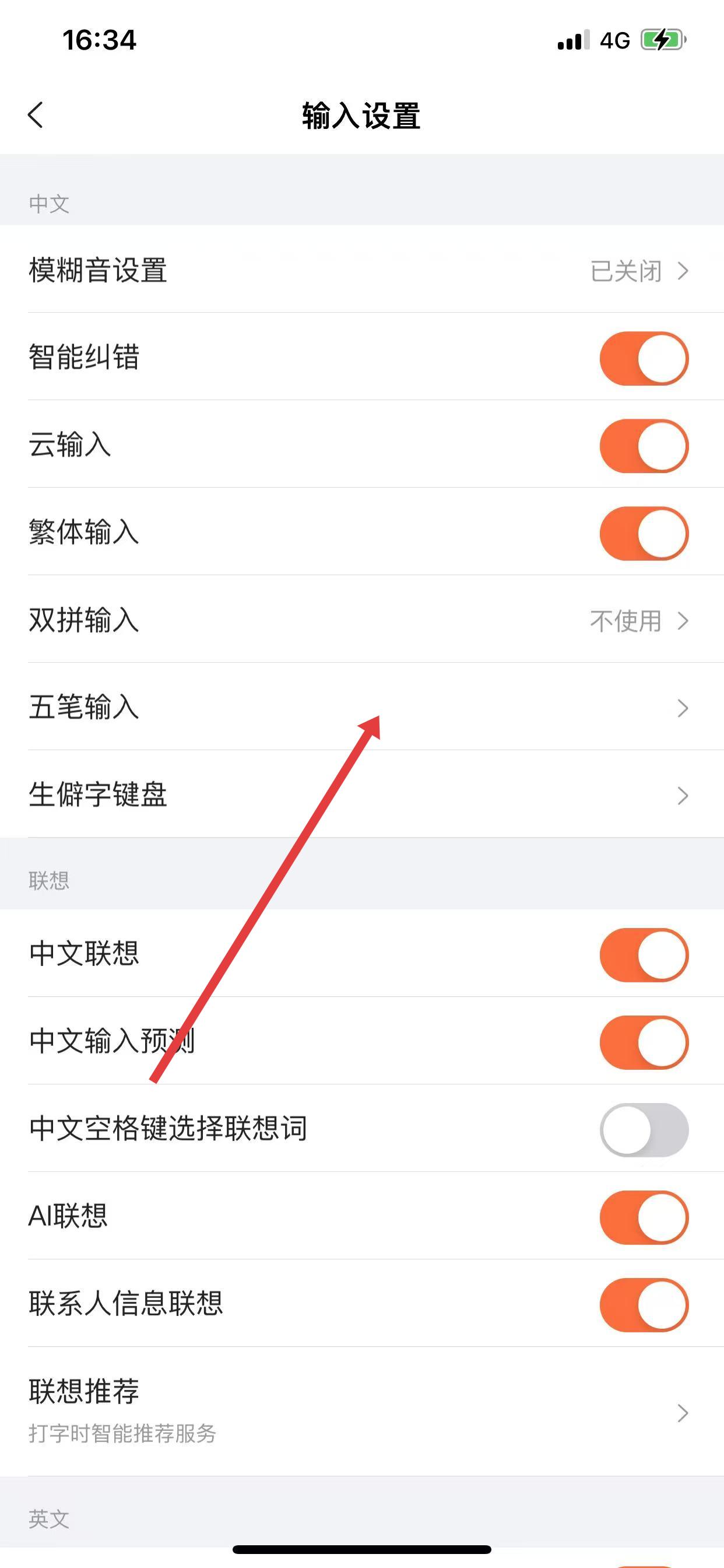 2、在輸入設置界面里,找到“五筆輸入”選項并點擊,進入五筆輸入設置頁面。