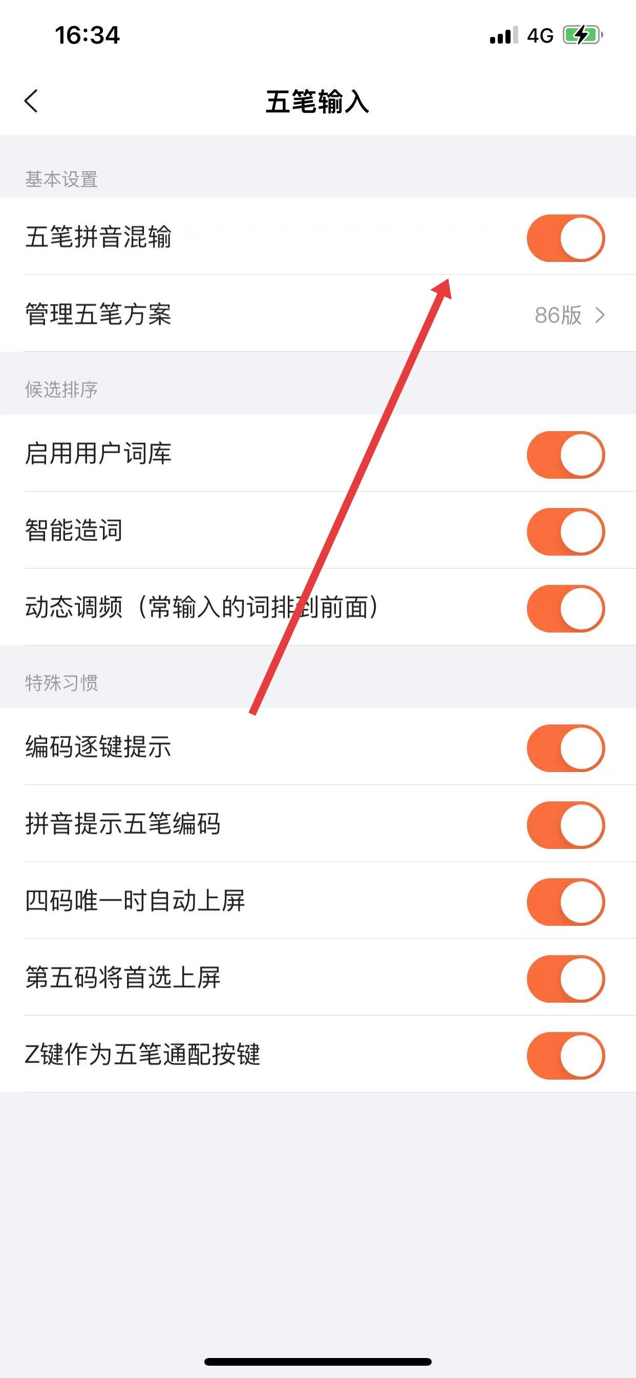 3、在五筆輸入設置頁面,根據(jù)需求開啟相關功能,比如五筆拼音混輸。