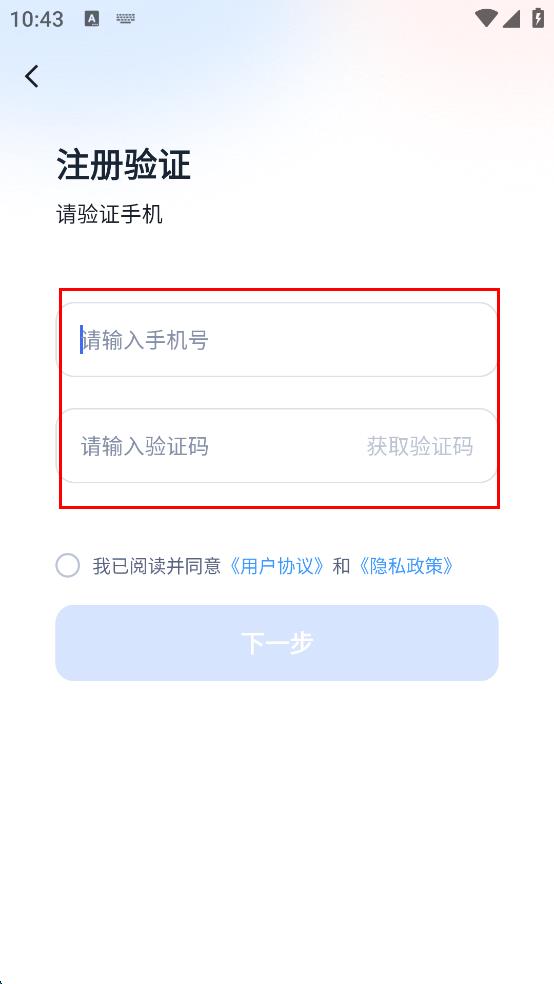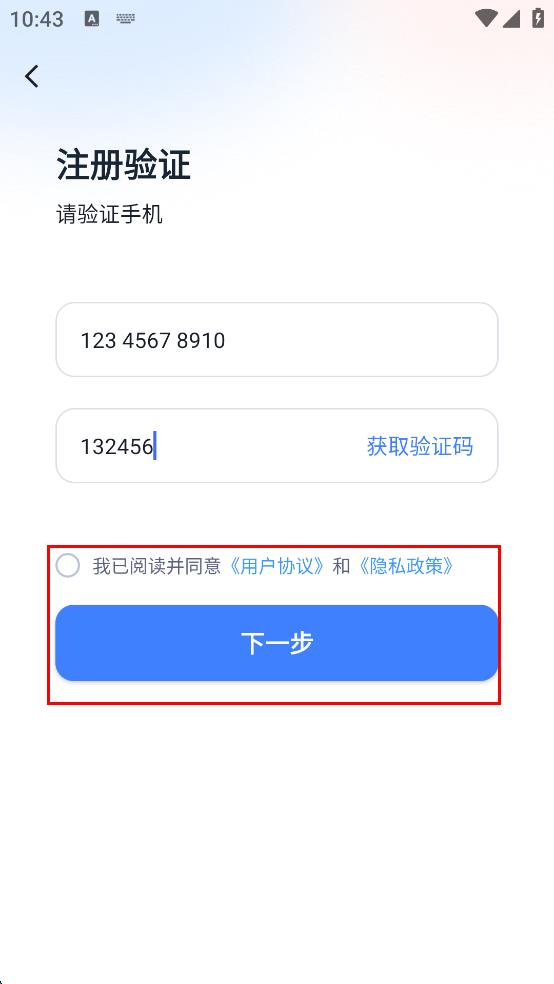 4、勾選我已閱讀并同意用戶協(xié)議和隱私政策,然后點(diǎn)擊“下一步”按鈕,進(jìn)行后續(xù)注冊(cè)流程。