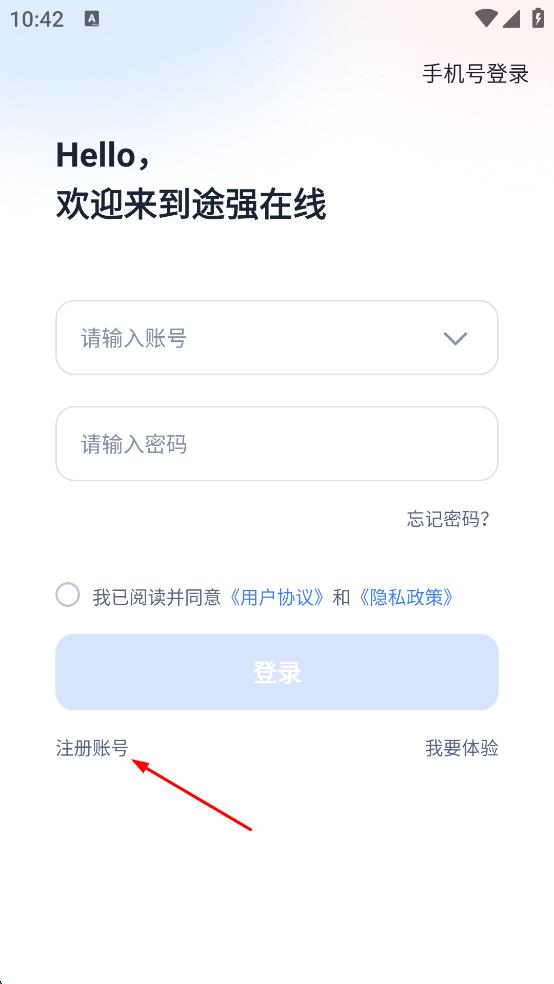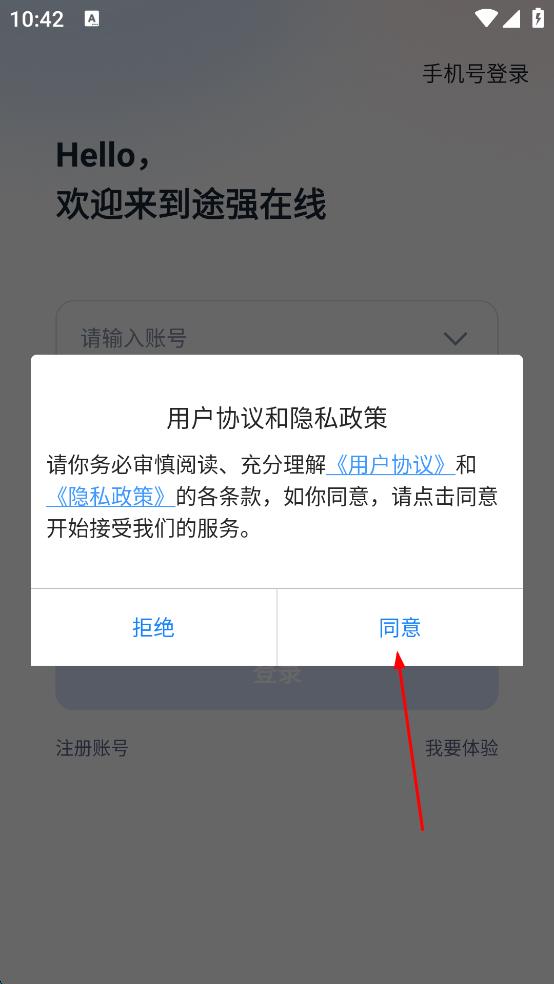 1、打開途強(qiáng)在線,出現(xiàn)用戶協(xié)議和隱私政策彈窗,點(diǎn)擊“同意”按鈕,進(jìn)入登錄界面。