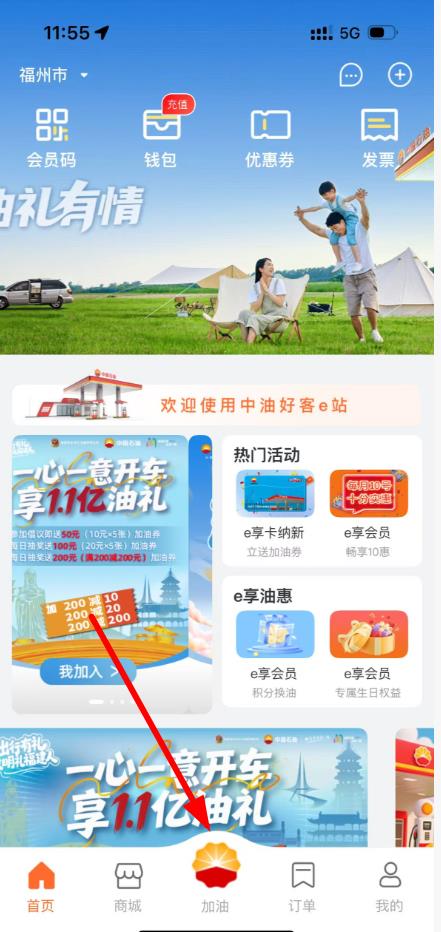 1、打開中油好客e站app進(jìn)入首頁(yè),點(diǎn)擊底部導(dǎo)航欄中的加油按鈕,進(jìn)入加油相關(guān)頁(yè)面。