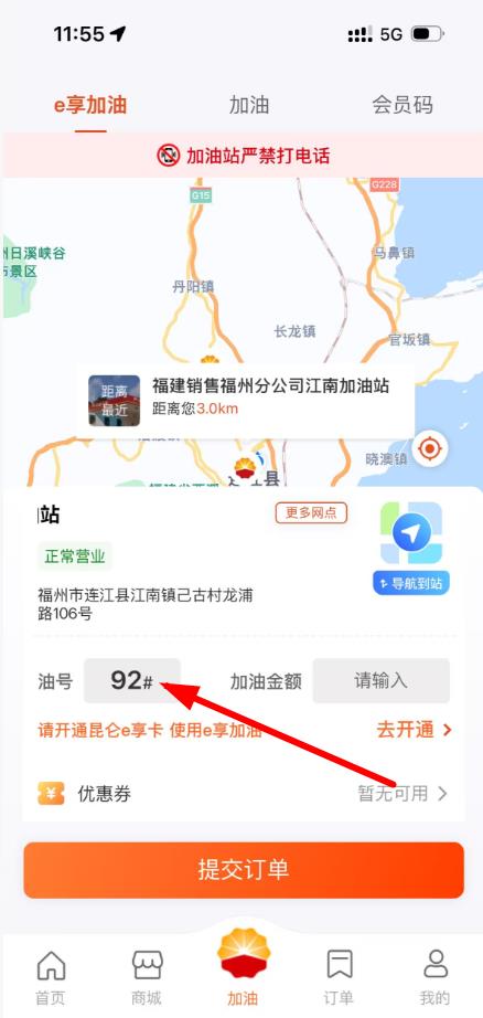 2、在加油頁(yè)面選擇合適的加油站,確認(rèn)油號(hào),比如92#,選擇完成后點(diǎn)擊加油金額輸入框。
