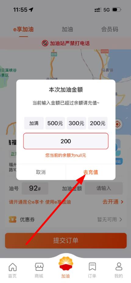 3、在彈出的本次加油金額窗口中,若輸入金額超過(guò)余額,會(huì)提示充值,點(diǎn)擊去充值按鈕,按提示完成充值油卡操作。