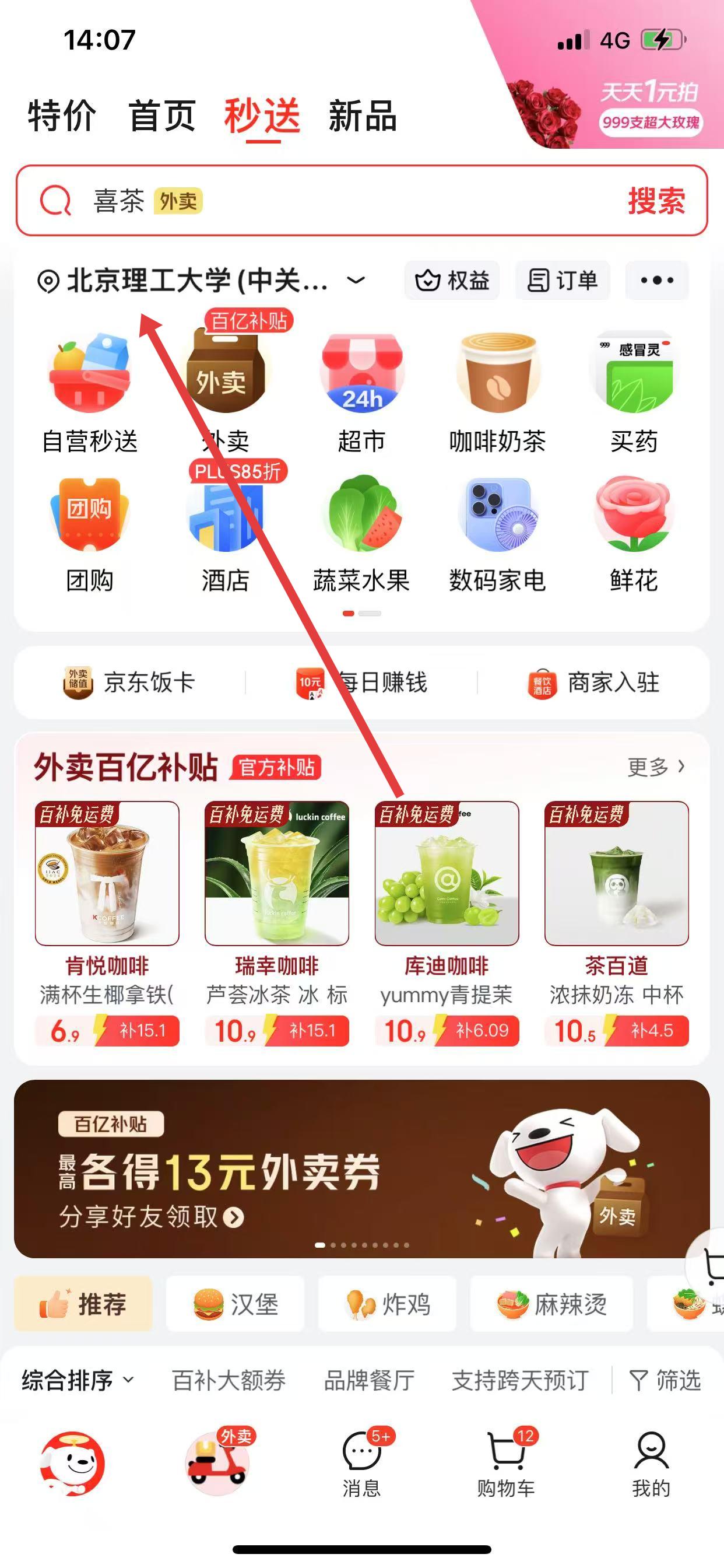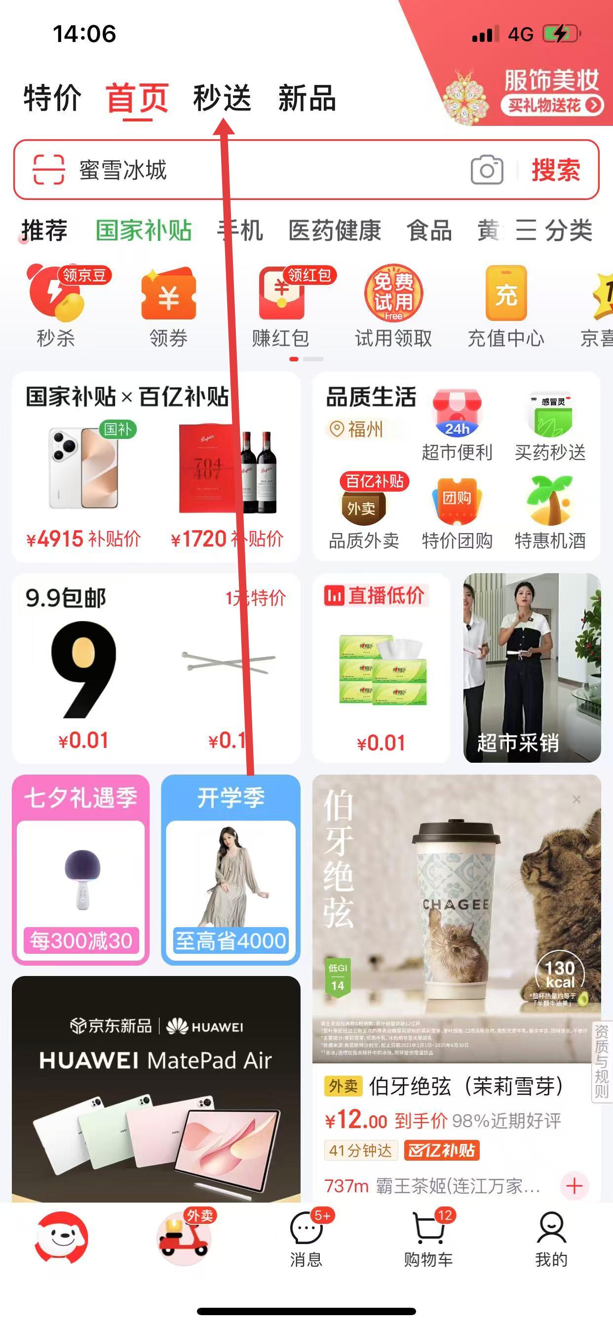 1、打開京東APP,進入首頁,在首頁的上方導航欄中,找到并點擊秒送選項,進入外賣服務頁面。