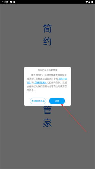 1、打開手機管家深度清理APP,進入時會彈出用戶協議與隱私政策,點擊同意的按鈕。