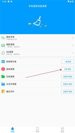 2、在首頁內,找到音頻清理并點擊右側立即清理的按鈕。