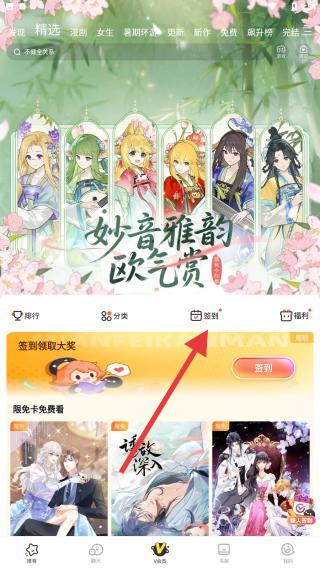 2、進(jìn)入到精選頁(yè)面的內(nèi)容中,可以先進(jìn)行簽到來(lái)領(lǐng)取簽到獎(jiǎng)勵(lì),也可以點(diǎn)擊想看的漫畫(huà)進(jìn)行瀏覽閱讀。