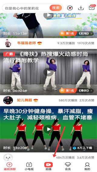 1、打開糖豆APP的首頁,需要點(diǎn)擊底部導(dǎo)航欄的拍攝按鈕,進(jìn)入拍攝的界面。